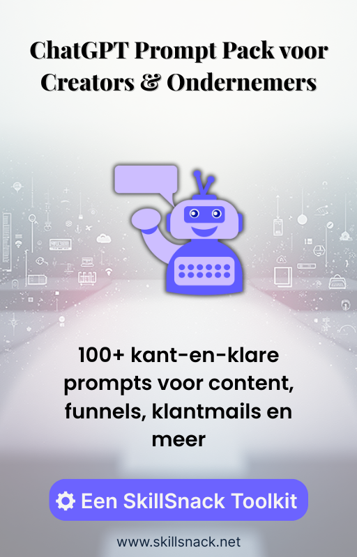Met het ChatGPT Prompt Pack voor Creators & Ondernemers krijg je meer dan 100 kant-en-klare prompts die je direct kunt gebruiken voor social media, funnels, e-mails, productideeën en meer.
